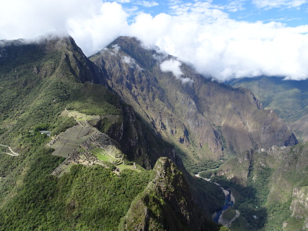 La montée commence par la signature d’un book qui permet de savoir si on est vraiment redescendu. C’est rassurant… Sympathique montée, étonnement ce n’est pas une autoroute. Après une grosse demie heure, on découvre le machu picchu vue de haut. Le sommet de wana n’est encore pas là, mais on aperçoit déjà quelques terrasses. La brume monte et on ne devine plus le machu picchu au loin.